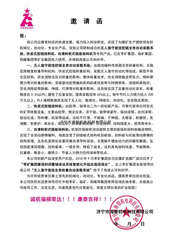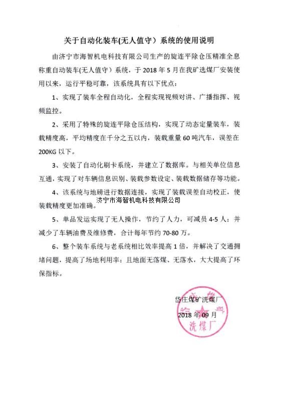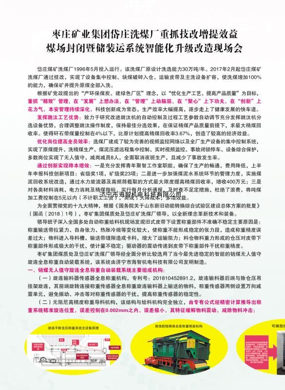本產(chǎn)品一經(jīng)推出即獲得各大設計院及用戶的一致好評,率先在棗礦集團岱莊煤礦取得成功應用,2018年9月受邀參加了《棗礦集團煤場封閉暨儲裝運系統(tǒng)智能化升級改造現(xiàn)場會》,智能裝車系統(tǒng)得到了充分肯定!我司憑借雄厚的加工制造實力及過硬的創(chuàng)新技術(shù)能力,勢必為運輸稱重系統(tǒng)、快速計量裝車系統(tǒng)帶來又一次的技術(shù)創(chuàng)新變革。
